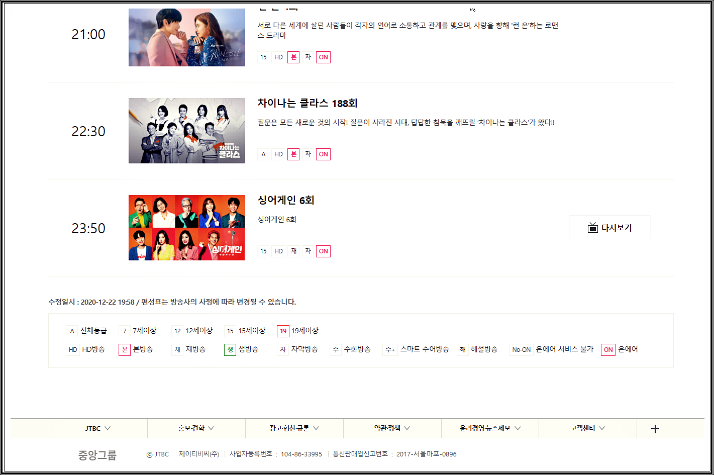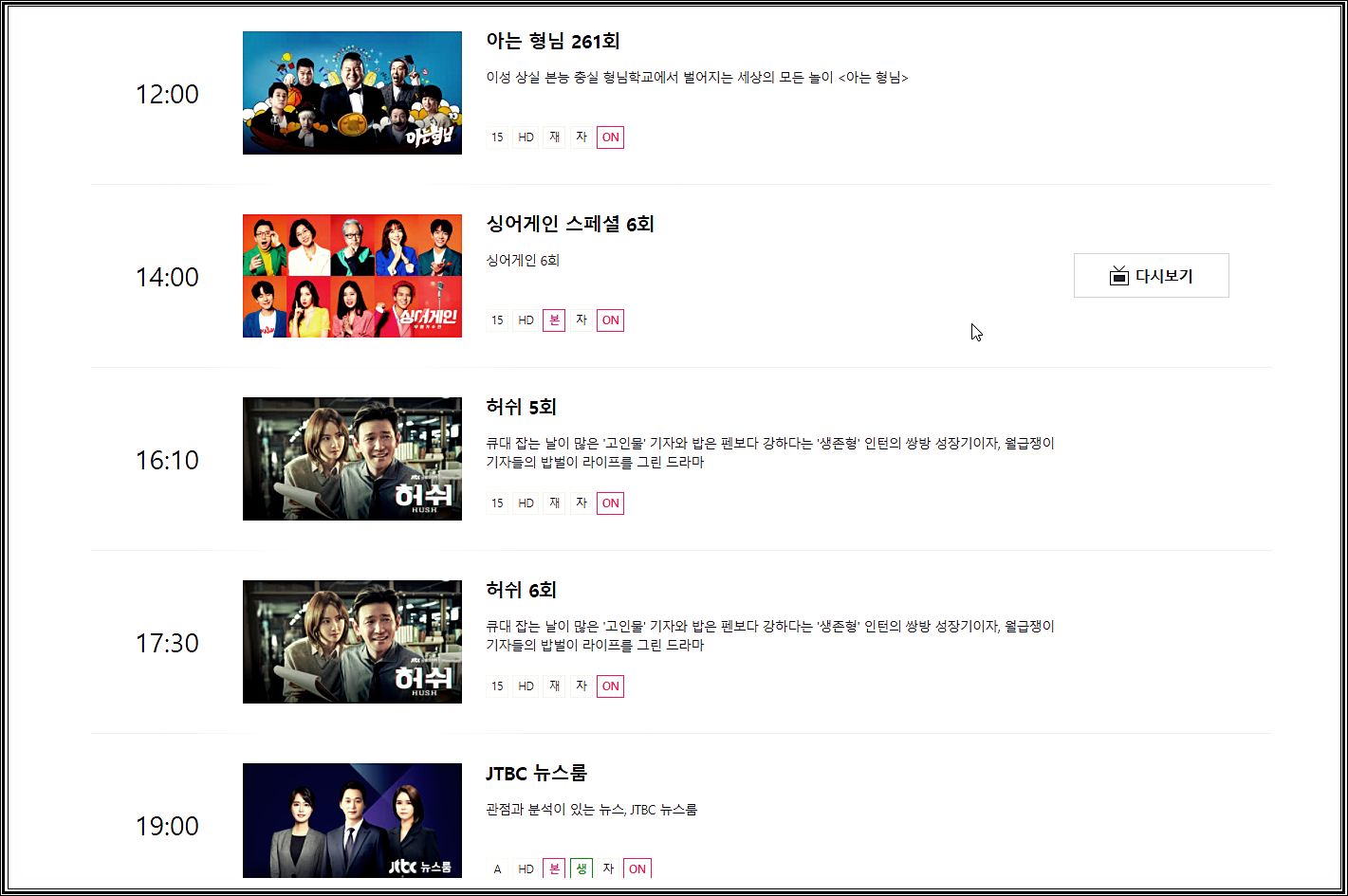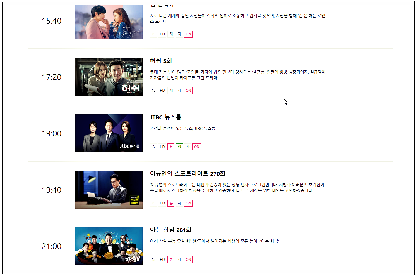 제이티비씨 홈페이지에 있는 편성표를 통해서 해당 프로그램의 관람등급을 확인할 수 있는데요. 전체등급, 7세이상, 12세이상, 15세이상, 19세이상이 있어요. 그리고 HD 방송인지 재방송인지 생방송인지 나와 있고요. 자막 지원 여부, 수화 방송, 스마트 수어방송, 해설방송, 온에어 등의 여부를 확인할 수 있어요.