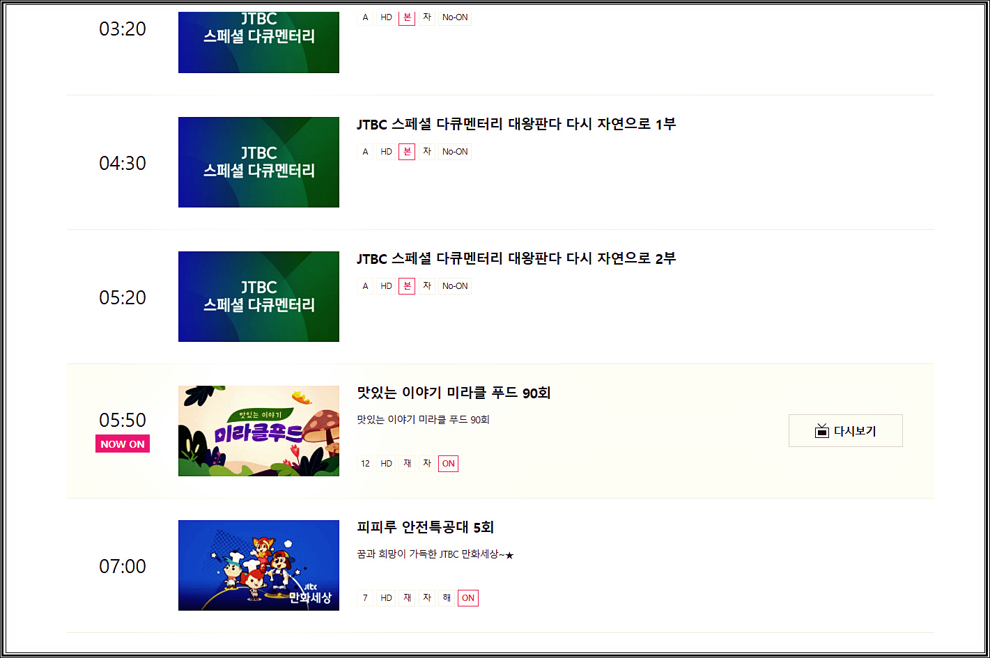 날짜별로 이렇게 JTBC 편성표를 볼 수 있어요. 스페셜 다큐멘터리 대왕판다 다시 자연으로, 맛있는 이야기 미라클 푸드, 피피루 안전특공대 등 프로그램들의 시간이 언제인지 확인해보시기 바랍니다.