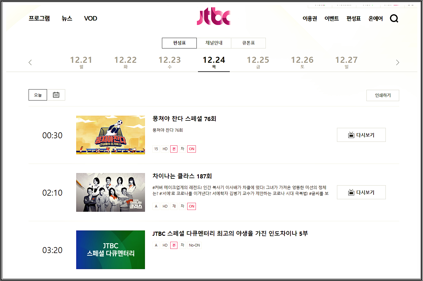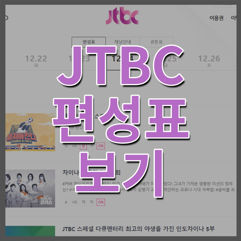 종합편성 채널 JTBC는 재미있는 프로그램들이 많은데요. 장성규 아나운서를 통해서 JTBC라는 방송국을 알게 되었습니다. 뭉쳐야 찬다, 차이나는 클라스, 싱어게인, 비긴어게인 등 재미있는 프로그램들이 많아요. JTBC 편성표는 홈페이지에서 볼 수 있는데요.