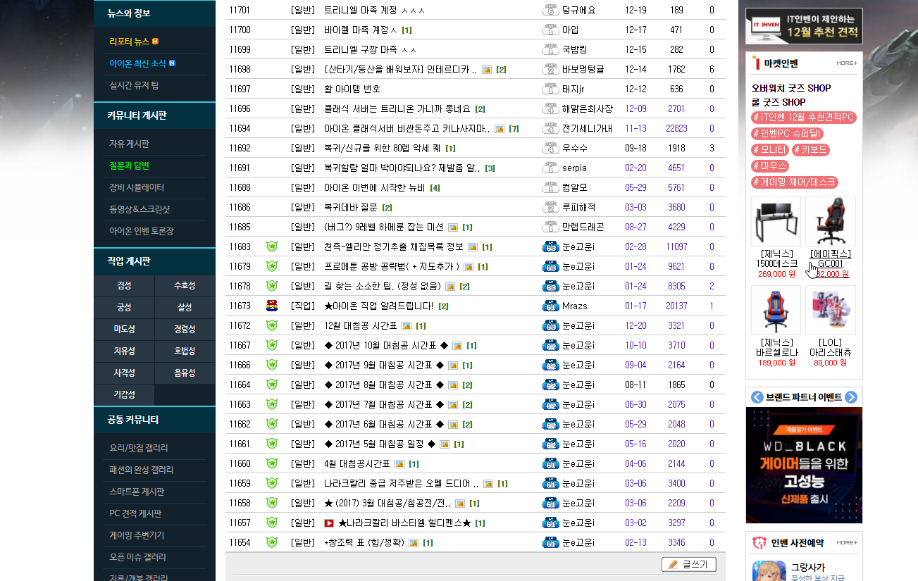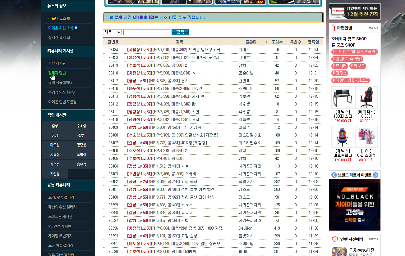 아이온 인벤에서 장비 시뮬레이터도 볼 수 있고 유저들이 올린 팁과 노하우를 볼 수 있는데요. 자유 게시판에서 파티를 구할 수도 있어요. 검성, 수호성, 궁도, 마도성 ,치유성, 호법성, 정령성, 살성, 사격성, 음유성, 기갑성별로 직업 게시판이 있는데요. 아이온 게임 직업별로 서로 정보 공유하면 좋겠네요.