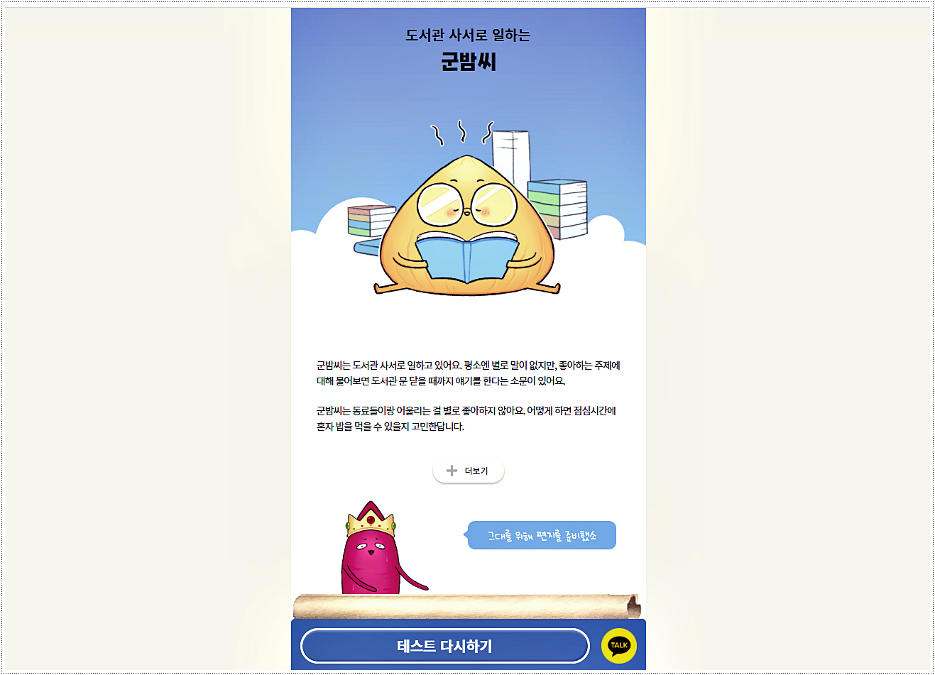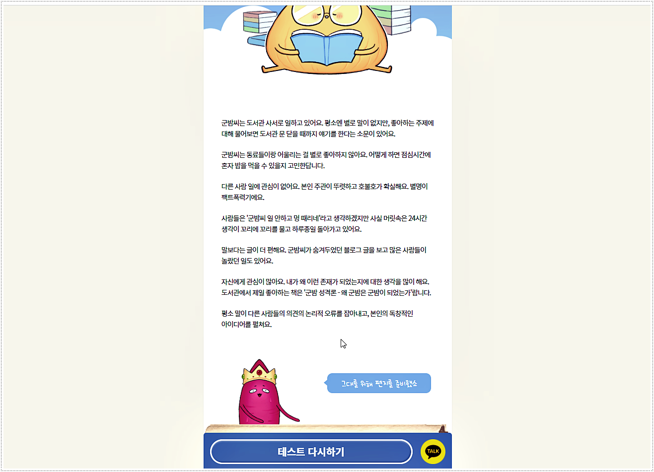 저는 스트리트 푸드테스트 결과로 도서관 사서로 일하는 군밤씨가 나왔는데요. 평소에는 조용하지만 자기가 좋아하는 것은 확실한 그런 성격의 간식인가봐요. 여럿이 있는 것보다는 혼자 있는 것을 좋아하고...