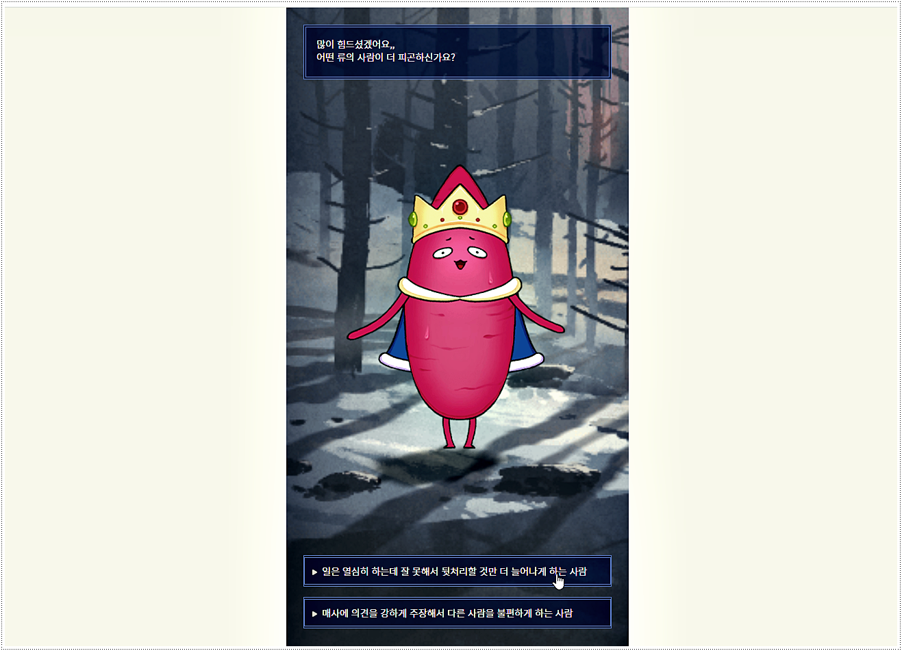 스트리트 푸드테스트에서 현재 가장 큰 고민이 뭔지 물어봤는데요. 그리고 어떤 류의 사람이 더 피곤한지 물어보네요. 저는 일은 열심히 하는데 일을 잘 못해서 뒤처리할 것이 늘어나게 하는 사람이라고 대답했어요.... ㅎㅎ
