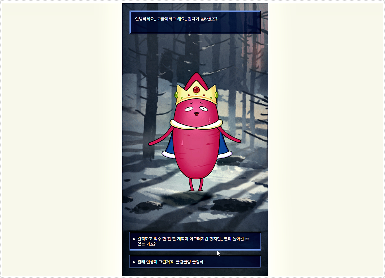 골목길을 걷다가 갑자기 나타난 고굼이... 이 보라색 고구마는 뭘까요? 일단 묻는 말에 대답을 해줍니다. 깜짝 놀랐냐는 고굼이의 말에 저는 '원래 인생이 그런거죠. 굴렁굴렁 굴렁쇠~'라고 대답했어요.
