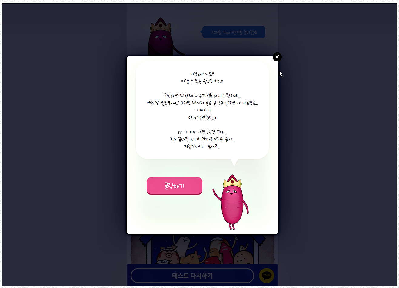 징징이 연애력테스트 소개팅 상대방에게 나는 어떤 모습일까요? 징징이 연애력테스트라는 것이 있는데 재밌어보여서 가져와봤습니다. ㅋㅋ 징징이와 대화를 통해서 알아보는 나의 연애 타입!!