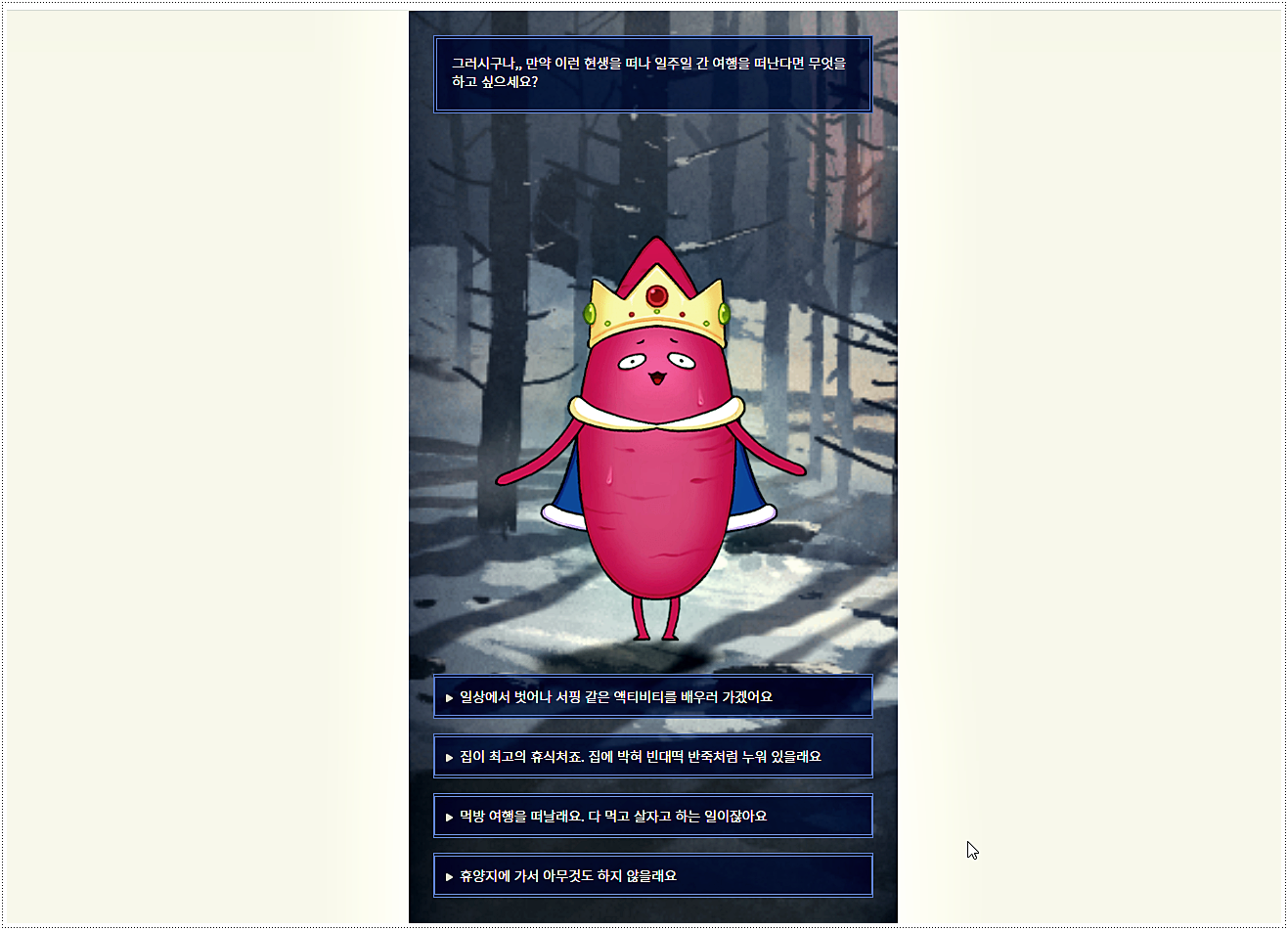 재미있는 게임 형태로 되어 있는 스트리트 푸드테스트!! 나와 가장 닮은 영혼의 스트리트 푸드를 찾아보는 건데요. 간식으로 알아보는 나의 성격 유형!! 재미있겠네요. ㅎㅎ
