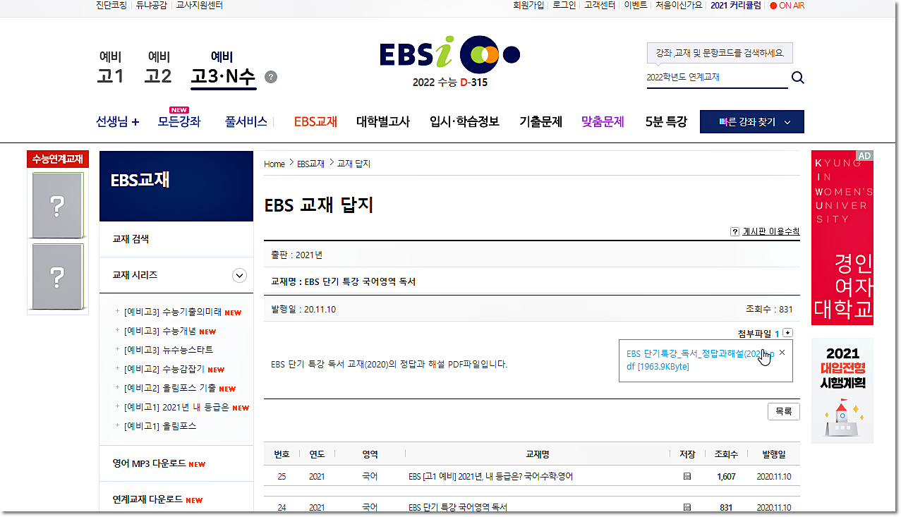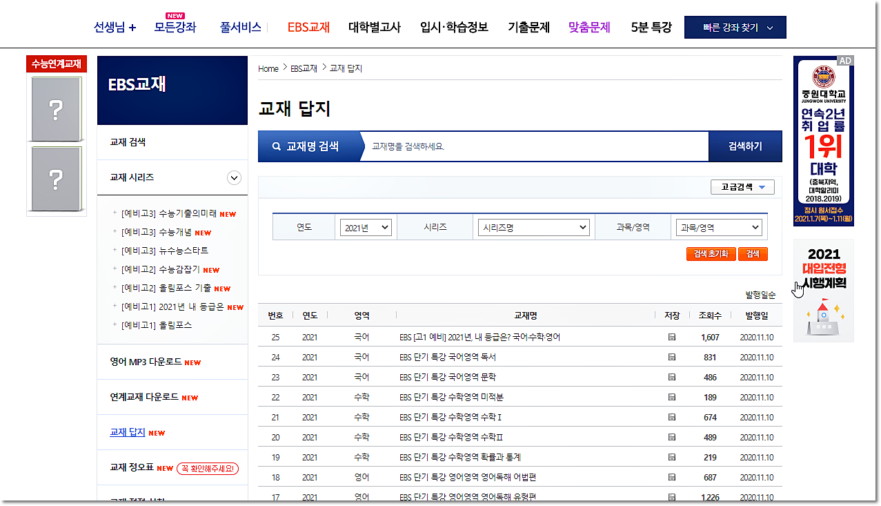 EBSi 홈페이지에서 정답과 해설 다운이