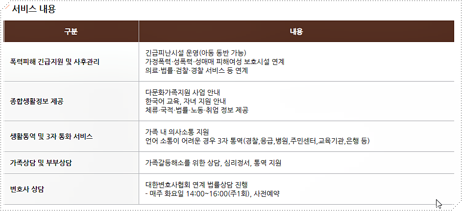 다누리 콜센터에서는 체류 자격 및 비자 연장 안내, 다문화 가족을 위한 복지 혜택, 건강보험 가입 방법, 혼인 및 가족 관계 신고 방법, 긴급 상황시 대처 방법 등을 안내해주고 있는데요. 폭력피해 긴급지원 및 사후관리, 종합생활정보 제공, 가족상담 및 부부 상담 등의 서비스를 제공하고 있습니다. 가정폭력, 성폭력, 성매매 피해 여성 보호시설 연계, 긴급피난시설 운영 등의 업무를 담당합니다.