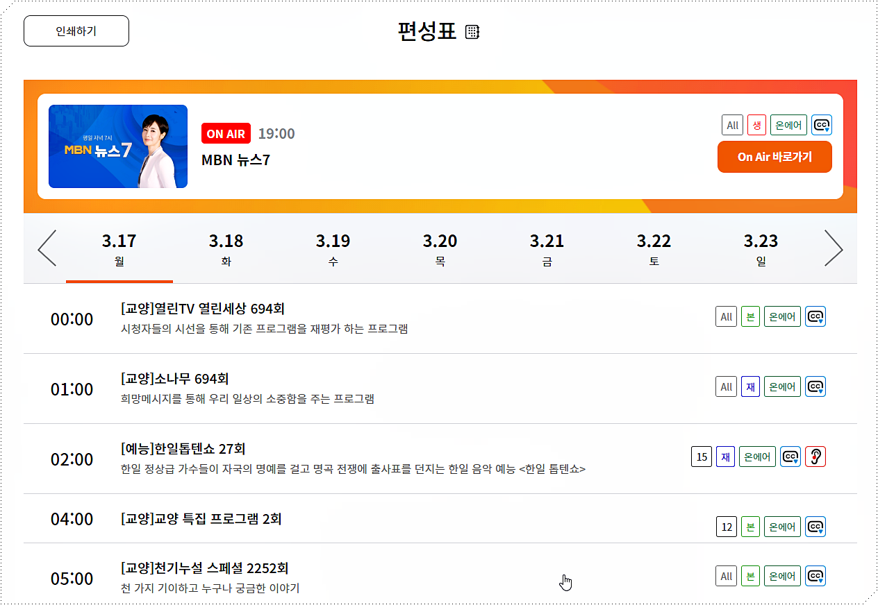 MBN의 편성표는 방송 시간별로 어떤 프로그램이 방영되는지 알려주는 중요한 정보입니다. 아래에 있는 바로가기를 통해서 MBN 편성표를 확인할 수 있습니다. 뉴스와 시사 프로그램 뿐만 아니라, 예능, 드라마, 다큐멘터리 등 여러 장르의 프로그램을 고루 배치하여 제공하고 있습니다.
