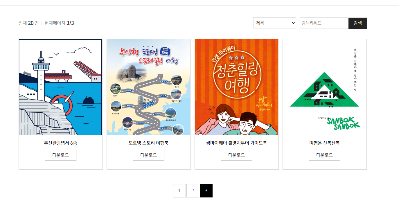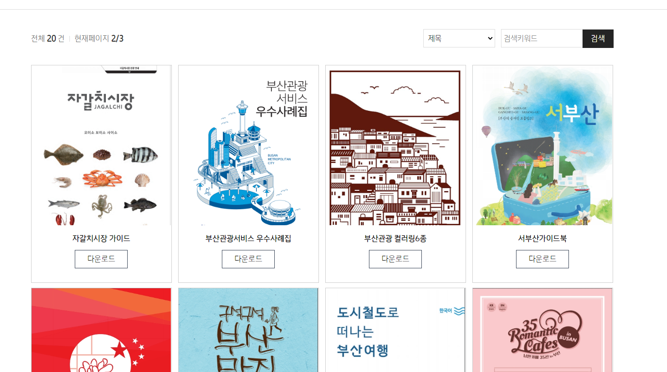 부산관광엽서, 도로명 스토리 여행북, 쌈마이웨이 촬영지투어 가이드북, 여행은 산복산복 등 관광정보를 확인해보세요.