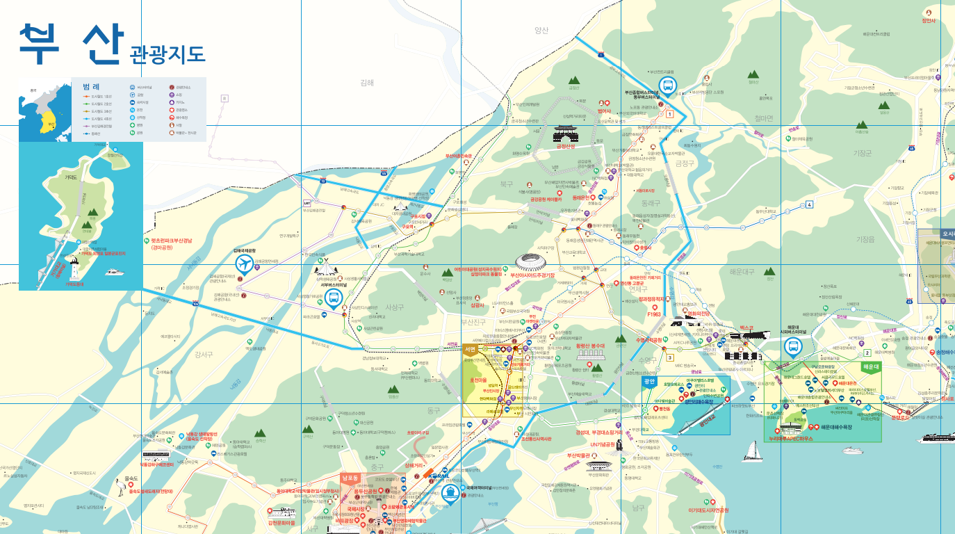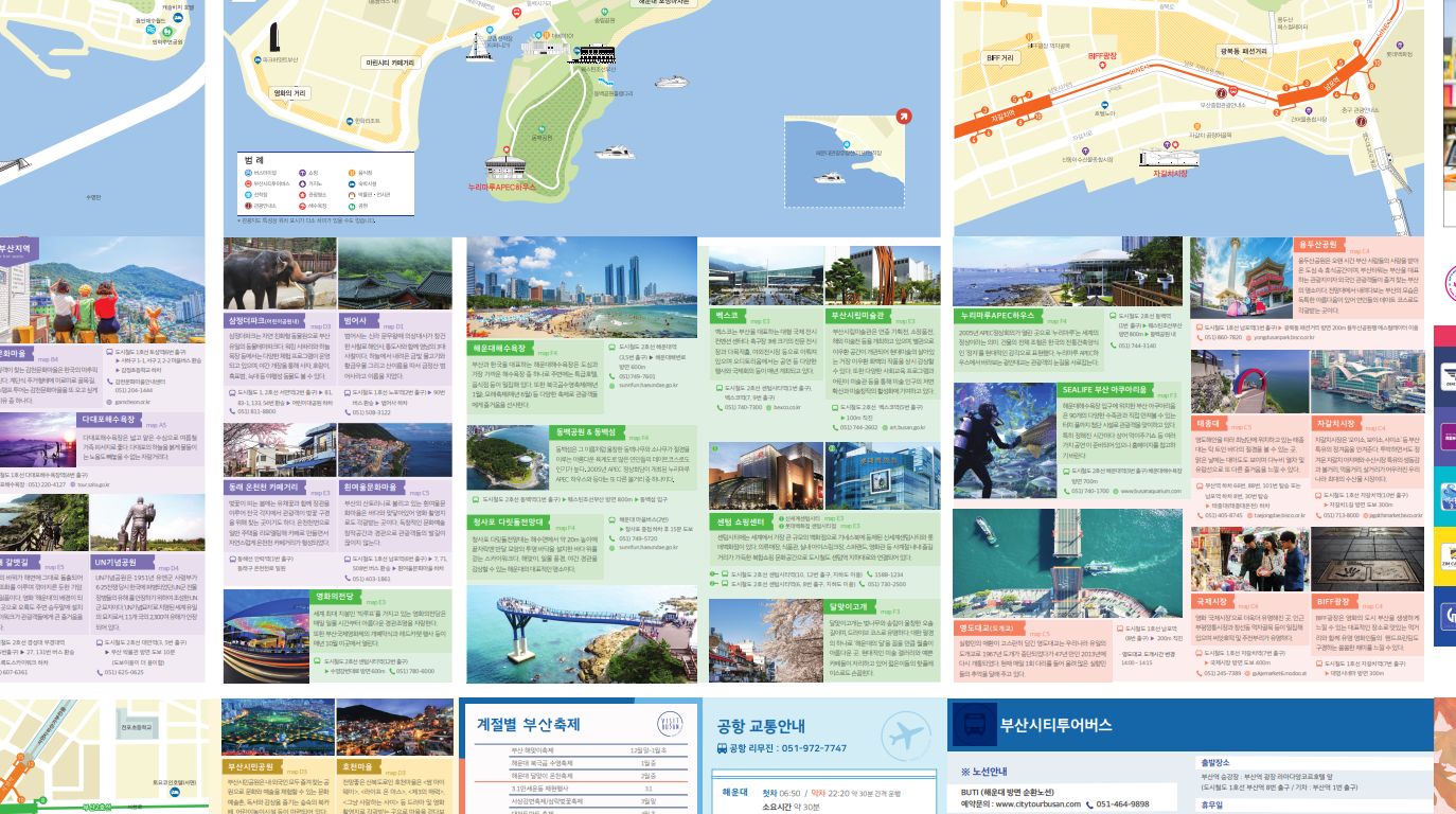 저는 부산 문화관광 홈페이지에서 관광지도를 다운로드 받았어요. 관광안내소, 문화관광해설사에 대한 안내도 나와있고요. 대한항공, 아시아나항공과 같은 항공사 전화번호 및 홈페이지 주소와 부산종합버스터미널, 서부산시외버스터미널, 부산항 국제여객터미널 등의 홈페이지 주소 및 전화번호도 나와 있어요.