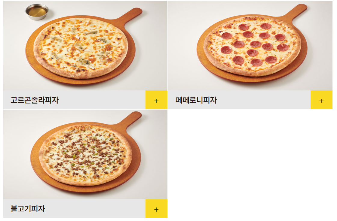 치킨플러스 메뉴 중에서 피자입니다. 고르곤졸라, 페퍼로니, 불고기가 있지요.