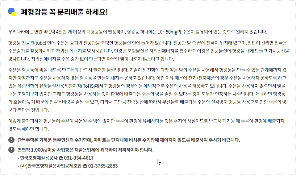 폐형광등은 반드시 분리배출하여 버리셔야 합니다. 깨졌을 경우 수은 등 인체에 해로운 물질이 포함돼 있을 수 있어서 별도의 방법으로 안전하게 배출해야 해요. 폐형광등 배출 방법은 동 주민센터나 아파트 단지 내에 설치된 폐형광등 전용 수거함을 이용하는 것입니다. 요즘은 구청이 지정한 장소에 설치된 수거함에 투명 비닐이나 종이로 감싸서 넣으면 되는데요. 반드시 형광등이 깨지지 않도록 주의해서 배출해야 해요.