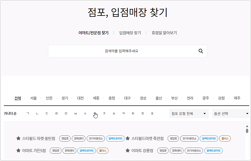 이마트 매장의 영업시간, 휴점일, 위치, 주소 등이 궁금하실 때가 있잖아요? 이럴 때에는 이 마트 공식 홈페이지에 있는 ‘점포찾기’ 기능을 이용하는 거예요. 홈페이지 상단 메뉴에서 ‘점포찾기’를 클릭하시고, 지역(예: 전라, 경기 등) 또는 원하는 도시명을 선택하신 다음 원하는 점포 유형(이마트, 트레이더스, 일렉트로마트 등)을 고르면 됩니다. 그러면 지도와 함께 주소, 영업시간, 주요 서비스(문화센터, 전기차 충전소, 주유소 등) 정보가 한눈에 표시돼서 정말 편하더라고요.