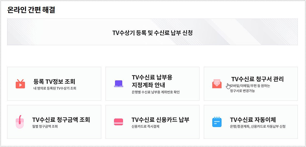 아래에 있는 바로가기 주소를 클릭하시면 KBS 홈페이지로 이동하게 되는데요. TV수상기 등록 및 수신료 납부 신청을 할 수 있습니다. 요즘은 콜센터를 통하지 않고도 온라인으로 편리하게 해결할 수 있는 부분이 많습니다. 예를 들어 등록 TV 정보 조회, TV 수신료 납부용 청구서 관리, 청구 금액 조회, 신용카드 납부, 자동이체 신청 등이 온라인으로 가능합니다. 저는 평소에 공과금을 자동이체로 관리하는데요. KBS 수신료도 똑같이 설정해두니 깜빡할 일이 없더라고요. 특히 카드 납부까지 지원하니까 적립 혜택을 챙기려는 분들에게도 유리합니다.