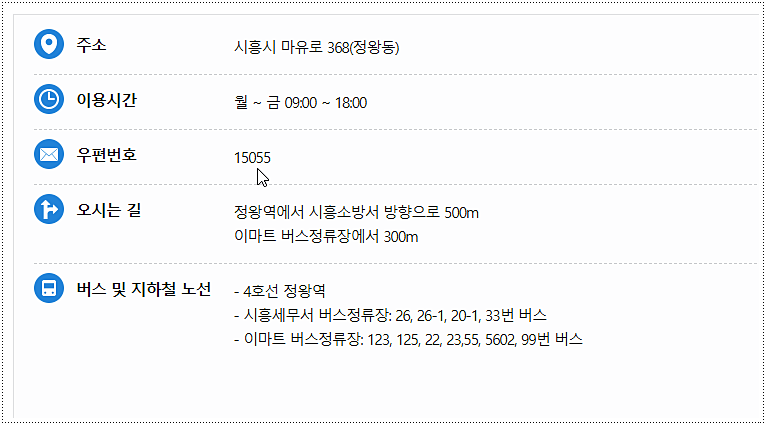| 버스 | 26, 26-1, 20-1, 33번 | 시흥세무서 | 도보 1분 |