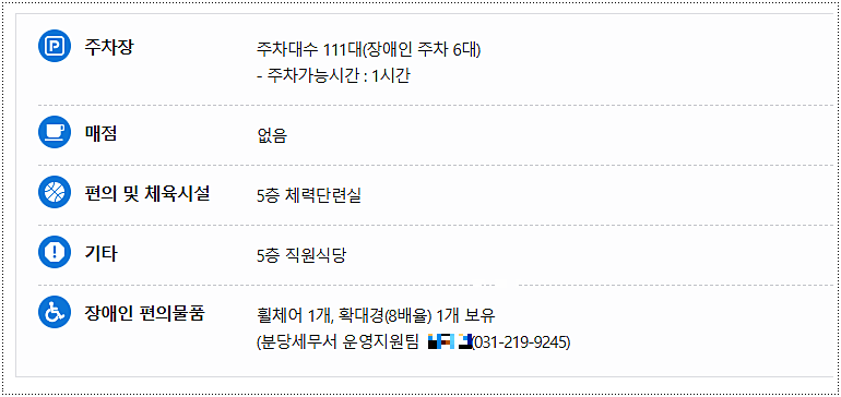 분당세무서는 장애인 편의에 대한 배려도 빠지지 않습니다. 휠체어 1대와 8배율 확대경 1개가 비치되어 있어 필요 시 요청할 수 있습니다. 관련 문의는 운영지원팀(담당자 심재현, 031-219-9245)으로 하면 친절히 안내받을 수 있습니다.