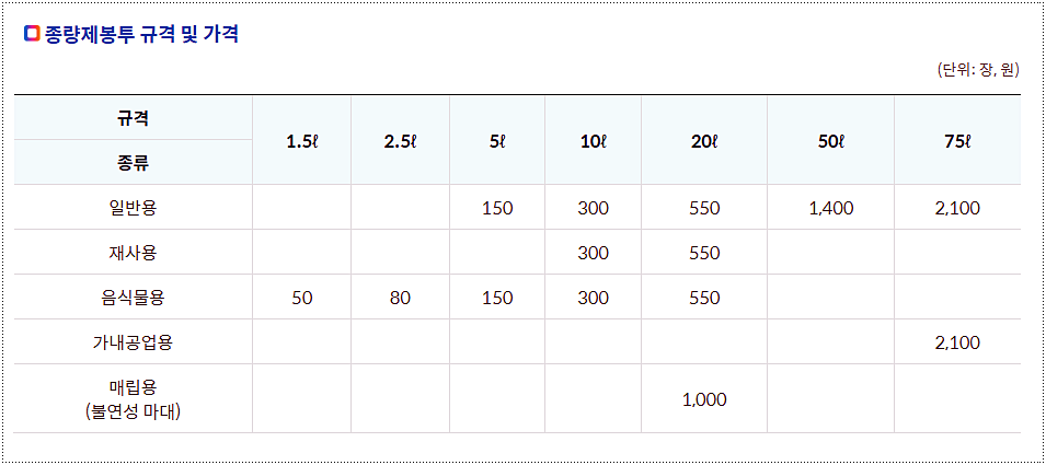 쓰레기봉투 가격표 정리