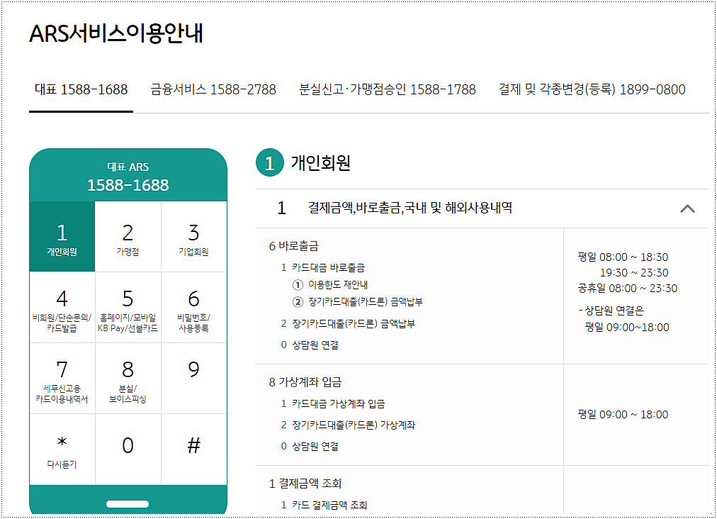 | 금융서비스(장기/단기 카드대출) | 1588-2788 | 카드론, 현금서비스, 분할상환 상담 |
