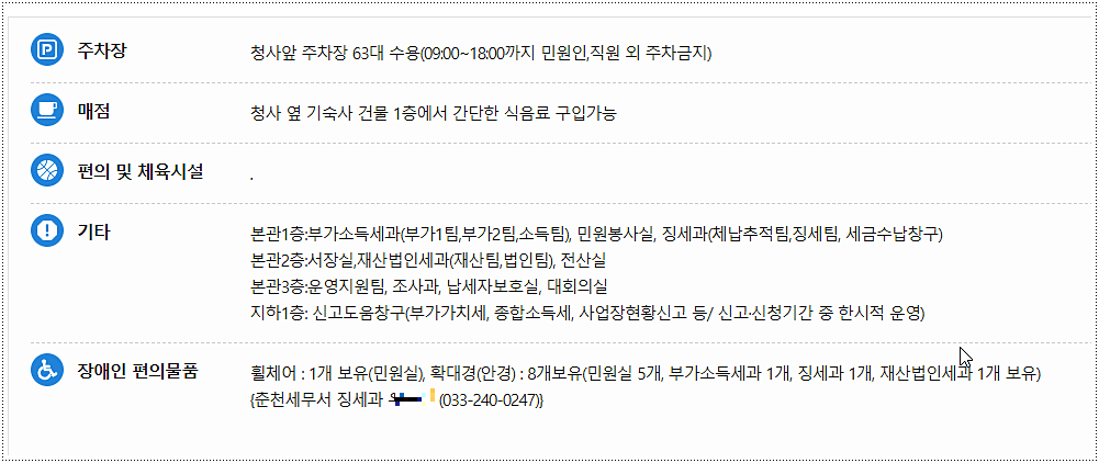 춘천세무서 세무 상담 창구에서는 신고 절차나 준비서류 같은 실전 정보도 상세하게 안내해주는데, 제가 방문했을 때도 직원분이 자료 제출 순서와 놓치기 쉬운 항목을 하나씩 짚어주어 업무를 보다 정확하게 마무리할 수 있었습니다. 체납과 징수 업무처럼 조금 무겁게 느껴지는 분야도 친절하게 절차를 설명해주어 부담이 줄어들고, 세무조사 관련 창구 역시 필요한 서류와 대응 방법을 명확하게 안내해줘 상황을 이해하는 데 큰 도움이 됩니다. 전체적으로 춘천세무서는 ‘업무가 복잡하다’는 선입견을 덜어주는 구조와 응대 방식 덕분에 초보 사업자도 편안하게 이용할 수 있는 곳이라는 인상을 줍니다.