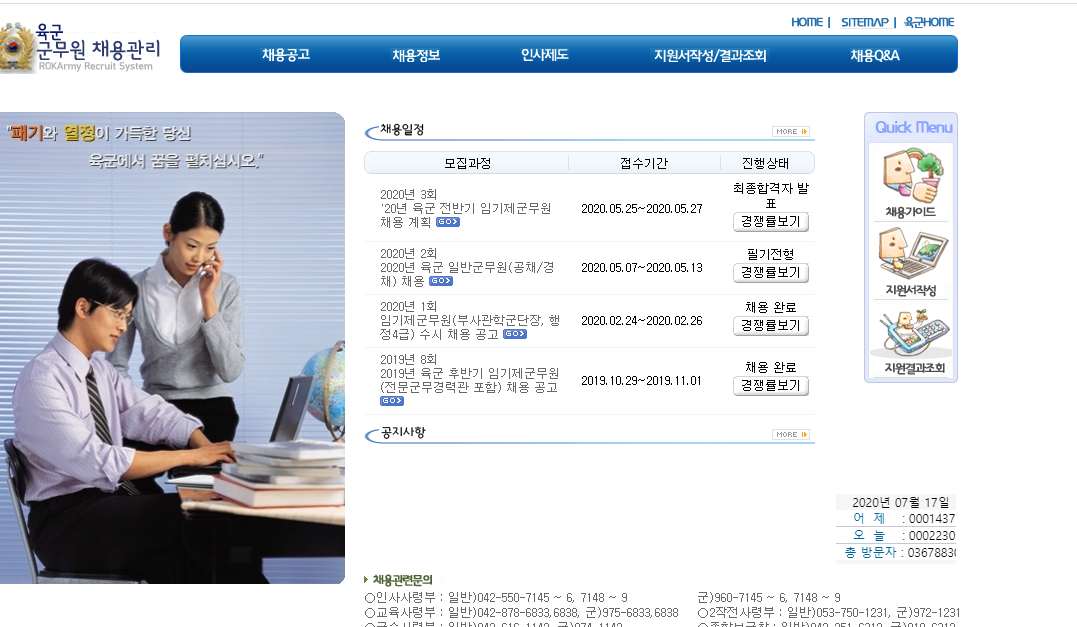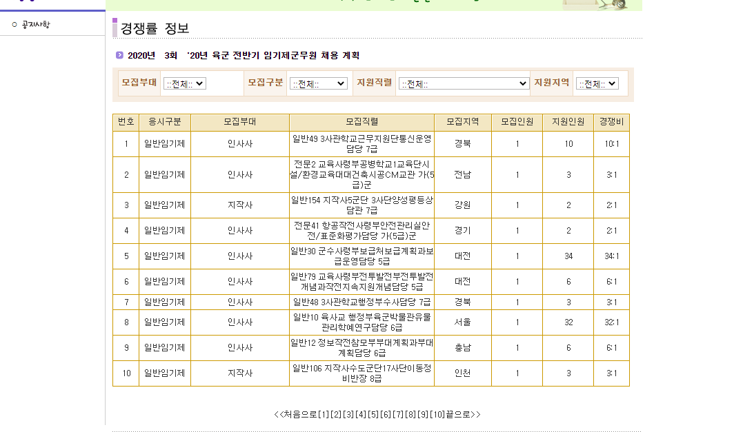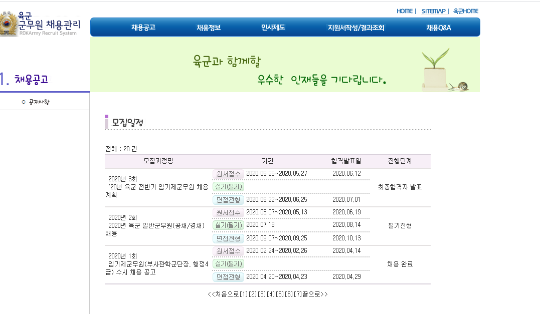 육군 군무원 채용관리 홈페이지에서는 공채 경채 채용일정과 채용공고를 확인할 수 있는데요. 현재는 육군 2020년 전반기 임기제군문원 채용 계획이 올라왔네요. 육군 일반군무원 공채 경채 채용 공고도 올라왔고요. 여기서는 원서접수 및 시험 일정, 경쟁률, 최종합격자 발표를 확인할 수 있어요.