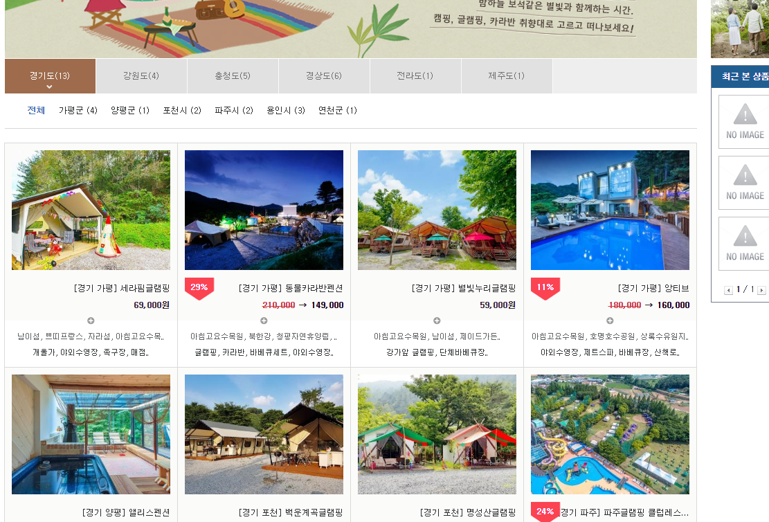 요즘은 캠핑, 글램핑, 카라반이 핫하죠. 이런 것도 지역별로 볼 수 있네요.